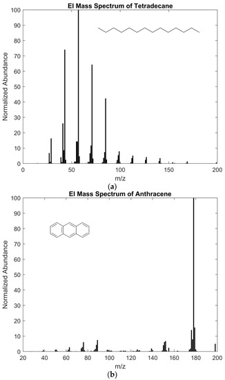 Representative mass spectra from the NIST 11 library for: (a) tetradecane (NIST record #229858); and (b) anthracene (NIST record #228201).