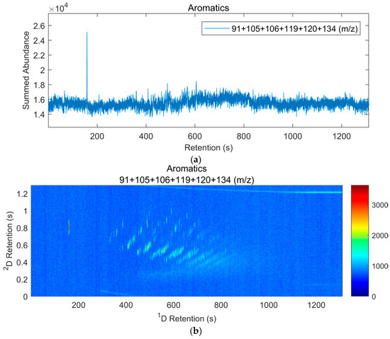 Heavy aromatic compounds illustrating structured retention information and high isomerism as observed on the summed aromatic EIC for the 1.0 μL/mL diesel using: (a) GC-TOF; and (b) GC×GC-TOF. The 2D retention axis has been shifted downwards by 0.55 s in both figures to account for the 2D tm.