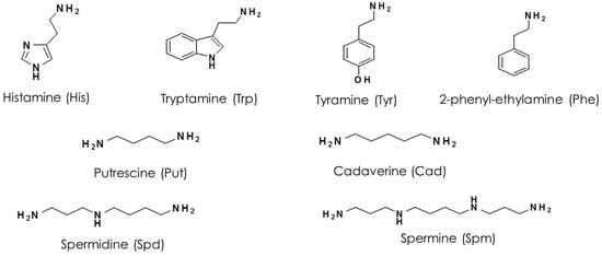 Biogenic amines (BAs) are organic bases characterized by a low molecular weight, a medium polarity and the presence of at least one aminic group bonded to an aliphatic, aromatic or heterocyclic moiety. BAs can be formed in food containing mainly proteins (or, simply, free amino acids) or also carbonylic compounds such as aldehydes or ketones. As a matter of fact, it is well known that the bacterial decarboxylation of amino acids or transamination of simple carbonylic compounds lead to the formation of BAs [,,]. Many BAs show severe adverse effects towards human health: tyramine (Tyr) is cytotoxic, causing the necrosis of the HT29 intestinal cells [], again Tyr, tryptamine (Trp) and 2-phenylethylamine (Phe) are vasoactive [], whereas histamine (His), putrescine (Put) and cadaverine (Cad) are toxic towards the nervous system []. The contemporary presence of Put and Cad in food potentiate the toxic action of His []. In addition, it has been demonstrated that BAs are possible precursors for the formation of carcinogenic N-nitroso species []. Finally, the polyamines spermine (Spm) and spermidine (Spd) are often naturally present in food []. However, also their excess has been recently associated with potential health risks [,]. Despite their recognized toxicity, the limit concentrations of BAs in fermented foodstuffs are far from being adequately standardized by regulatory agencies.