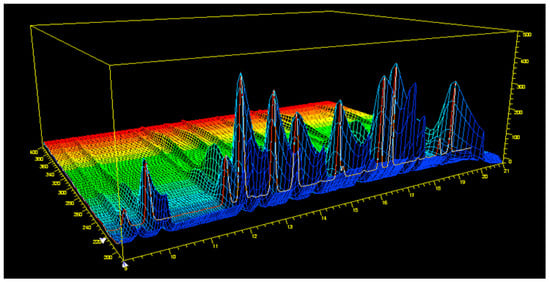 Literature findings suggested the detection of dansyl derivates of biogenic amine at 254 nm []. However, the analysis of DAD spectrum of dansyl derivates of all biogenic amines standards at 5 µg/mL revealed a maximum of absorbance at 218 nm for all analytes (Figure 2). Figure 3 shows the chromatographic profile of dansyl derivates of biogenic amines standards at 5 mg/L detecting both at λ = 254 nm (Figure 3A) and at λ = 218 nm (Figure 3B). A higher signal-to-noise ratio was observed at the lower wavelength, hence the 218 nm wavelength was used in this study.