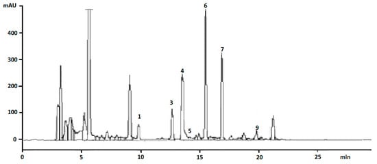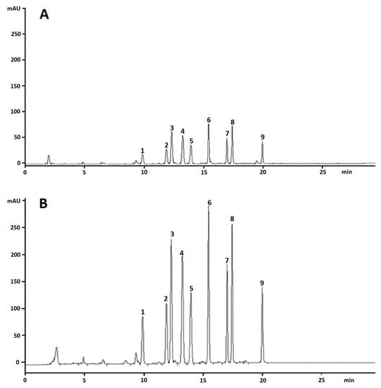 Chromatographic profile of dansyl derivates of standard solution (concentration: 5 mg/L each) of BAs. (A) λ = 254 nm; (B) λ = 218 nm. Peak sequence: 1 = Trp; 2 = Phe; 3 = Put; 4 = Cad; 5 = His; 6 = 1,7-diaminoheptane, internal standard; 7 = Tyr; 8 = Spd; 9 = Spm.