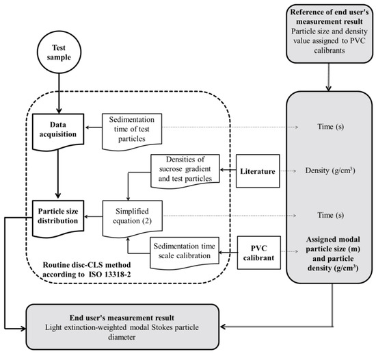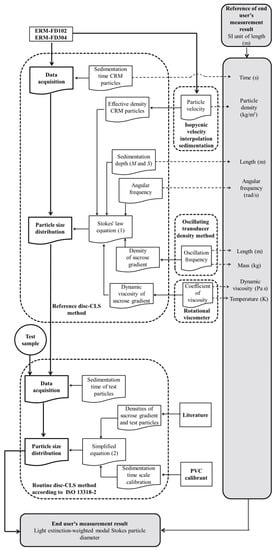 The following are available online at https://www.mdpi.com/2297-8739/6/1/15/s1, Figure S1: Metrological traceability network attempting to link disc-CLS particle size measurement results to the SI unit of length through PVC calibration particles characterized by transmission electron microscopy and isopycnic velocity interpolation sedimentation, Figure S2: Temperature dependence of dynamic viscosity (open squares) and density (solid squares) of 20 g/kg (a) and 80 g/kg (b) sucrose solutions. The error bars correspond to the standard deviation; dashed lines represent linear fits, Figure S3: Simplified schematic of the functioning hollow disc (front view) of a disc-CLS instrument. The disc is partly filled with a carrier fluid which comprises a radial density and viscosity gradient after stabilization. The dilute sample is injected at the center of the disc (solid black circle). Particles travel radially outward through the density/viscosity gradient (dark blue ring) and sedimentation times are recorded by the photodetector (black solid square) whose radial position is given by the dotted black circle. A ring of water-based dispersant liquid (light blue ring) is formed on top of the density/viscosity gradient, Equation (S1): sedimentation velocity of a particle in a centrifugal field, Equation (S2): Stokes law when considering a linear gradient in viscosity and density, Equation (S3): calculation of the fluid density term, Equation (S4): calculation of the fluid viscosity term, Equation (S5): Linear extrapolation of the average density of carrier fluid, Table S1: Overview of key parameters (all replicates) for the direct calculation of Stokes diameter results using the reference disc-CLS method, Table S2: Uncertainty budget for a single disc-CLS measurement (reference method) of ERM-FD304.