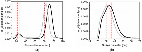 Overlay of representative light extinction-weighted PSDs of colloidal silica ERM-FD102 (a) and ERM-FD304 (b) obtained by the routine (black curves) and reference (gray curves) disc-CLS methods. The vertical dashed lines correspond to the certified ranges of the modal diameters for the two CRMs. The ordinates correspond to the natural logarithm of the ratio of the incident (I0) and transmitted light intensity (I).