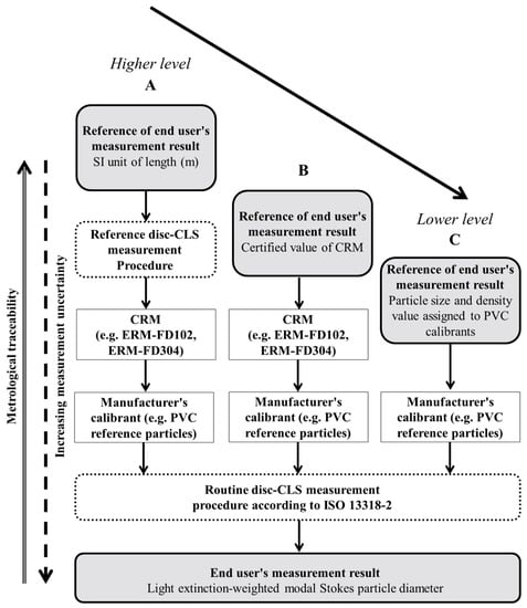 Materials consisting of spherical particles of polyvinyl chloride (PVC) with assigned particle size and particle density values, supplied by the main manufacturer of disc-CLS instruments (CPS Instruments, Inc., Prairieville, LA, USA) are used almost exclusively for the calibration of the sedimentation time scale. The suitability and reliability of these calibrants have been validated in a previous study [6]. In that study, the particle size and effective particle density of selected PVC calibrants were experimentally determined using different validated methods. The results confirmed, on the one hand, that different types and batches of PVC calibrants are very consistent with respect to their effective particle density (i.e., 1.385 g/cm3), and, on the other hand, they also demonstrated that the assigned modal particle diameter and particle density values are accurate within 5% and 3.5% respectively (at a 95% confidence level). Thanks to the use of these PVC calibration particles, the disc-CLS method [7] has now become an important part of today’s nanoparticle characterization toolbox. Although the reliability of the PVC calibration materials has thus been demonstrated [6], the actual comparability of the measured particle size results obtained for routine test samples is; however, limited because the critical properties (i.e., particle size and particle density) of the used calibration particles (PVC or other), have often not been characterized in a metrologically sound manner. For example, the “particle size” measurand is not always unambiguously defined, and uncertainties and traceability statements are often not given by the calibrant manufacturer. As a result, particle size measurement results obtained by the commonly used disc-CLS method (Equation (2)) are mostly only traceable to the property values of the calibrant used and not to the SI unit of length (Figure 1), which is the ultimate metrological reference of the particle size traceability network.