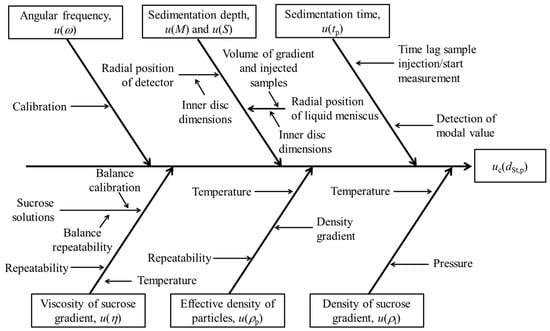In the previous section, we showed SI-traceability of particle size results, obtained with the reference disc-CLS method, by relating each input quantity value of the underlying measurement model to its relevant SI unit. As can be seen from the VIM’s definition of metrological traceability, however, the traceability network alone is insufficient to allow a meaningful comparison of measurement results without also specifying the measurement uncertainty. Indeed, each measurement unit that occurs in the traceability network has been practically realized from laboratory measurements whose results are imperfect estimates of the different measurands. These imperfections arise from both systematic and random uncertainties. To allow for meaningful comparisons, the final measurement result must be accompanied by a realistically estimated measurement uncertainty that combines the significant uncertainty contributions from the different input quantity values. The input quantities whose uncertainties are considered to have a significant influence on the combined uncertainty, uc(dSt,p), of the output quantity or the measurand, dSt,p, are arranged in the fishbone diagram shown in Figure 5. The relative uncertainties related to the main branches of the fishbone diagram are estimated according to the procedures described in the Guide to the Expression of Uncertainty in Measurement (GUM) [20]. Considerations for estimating each uncertainty component are discussed below.