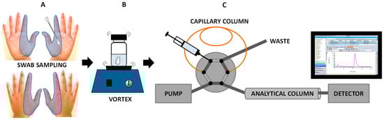 | Liquid chromatography- tandem mass spectrometry/34,000 ng | Cotton swab moistened with isopropyl alcohol:water, 75:25, which was introduced in a tube with 3.2 mL of the mixture and centrifuged. The aliquot was diluted five times with deionized water. SPEC C18 cartridges were conditioned with 250 µL of isopropyl alcohol and deionized water. 5000 µL of aqueous samples were loaded. The sorbent was rinsed with 250 µL of deionized water and dried. The analytes were eluted in acetonitrile:water:methyl alcohol, 80:10:10; 200 µL | 0.29–83 nmol/L | Acetonitrile: methanol: water, acidified by 0.1% of formic acid; 200 µL/min; 20 µL | Isopropylalcohol as extraction solvent, methanol and acetonitrile for mobile phase | [18] |