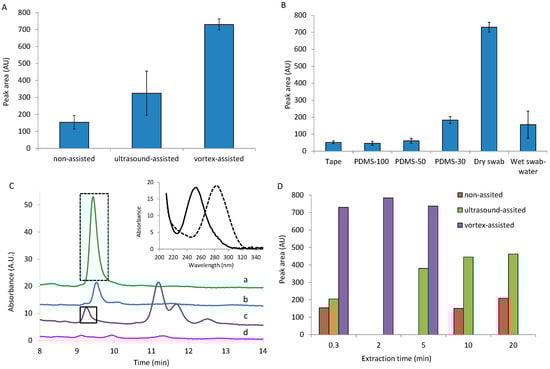 | IT-SPMS-CapLC-DAD/0.15 ng/mL (solution) 0.3 ng by cotton swab | DPA was extracted from hands by cotton swab and then DPA was extracted to 2 mL of water under vortex conditions (20 s) | ˂LOD-16.5 ng | Acetonitrile: water gradient; 10 µL/ min; 72 µL | Water as extractive solvent. Acetonitrile as mobile phase | This work |