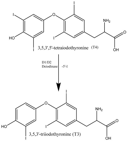- Escobar-Morreale, H.F.; Obregon, M.J.; del Escobar Rey, F.; Morreale de Escobar, G. Tissue-specific patterns of changes in 3,5,3-triiodo-L-thyronine concentrations. Biochimie 1999, 81, 453–462. [Google Scholar] [CrossRef]