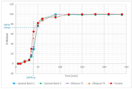 This paper investigates the bioavailability profile, using simulated in vitro gastrointestinal extraction media, of thyroid hormone supplements that contain either a single or a dual combination of the two hormones using biorelevant dissolution media. In addition, the bioavailability profile is compared against the standard United States Pharmacopoeia (USP) quality control test specification of 70% release within 45 min for individual dosage forms of thyroid hormone supplements [17,18].