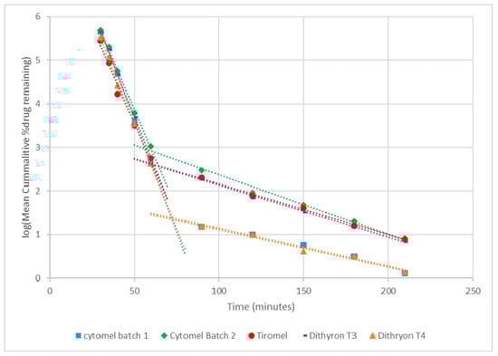 The kinetics of dissolution have been investigated using a first-order rate constant (Figure 3). It was observed that a two-stage dissolution process occurs with crossing points determined by extrapolation of the line of best fit. The initial rate constant corresponds to tablet coating dissolution while the second rate constant is indicative of tablet breakdown. The rate constants (k) were calculated to be between 5.3–6.1 h−1 and 0.4–0.8 h−1 for coating removal and tablet solubilization, respectively. The rate constant was calculated based on the change in cumulative % drug remaining over time ((y2 − y1)/(x2 − x1)) with y calculated using the equation of the line.