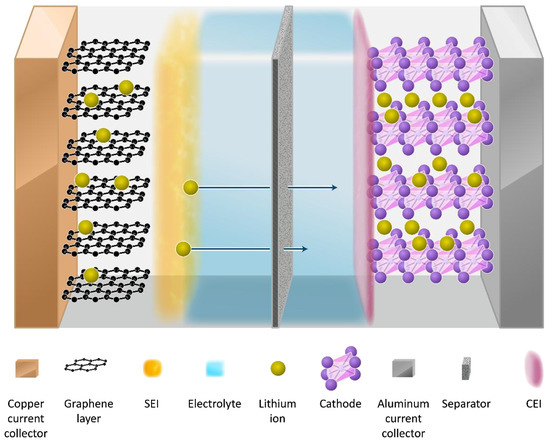 In Figure 1, a schematic illustration of a LIB during the discharge process is shown. The negative electrode (anode) consists of graphite and the positive electrode (cathode) of a layered lithium transition metal oxide. A permeable membrane soaked with the electrolyte separates the two electrodes [14,15,16]. Upon charge, the lithium ions are de-inserted from the positive electrode, transported through the electrolyte, and then intercalated into the negative electrode. The process is then analogously reversed during the discharge process.