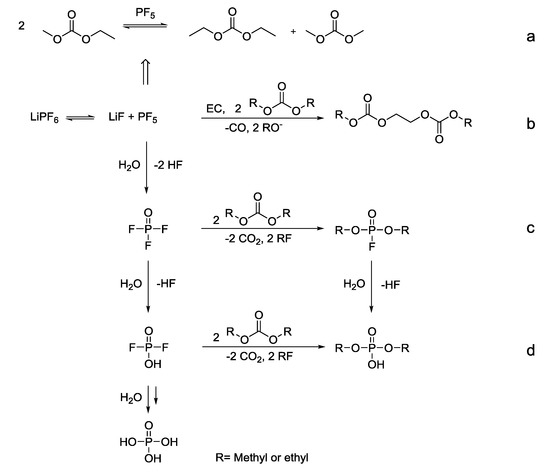 With respect to POF3, hydrolysis to inorganic phosphates occurs [126], several reactions with the organic carbonates can lead to the formation of organophosphate-based (Figure 2d), organofluorophosphates-based (Figure 2c) and oligocarbonate-based (Figure 2b) decomposition products [42,49,50,52,53,127,128,129,130,131]. Additionally, PF5 can initiate the transesterification of EMC to DEC and DMC (Figure 2a) [127].