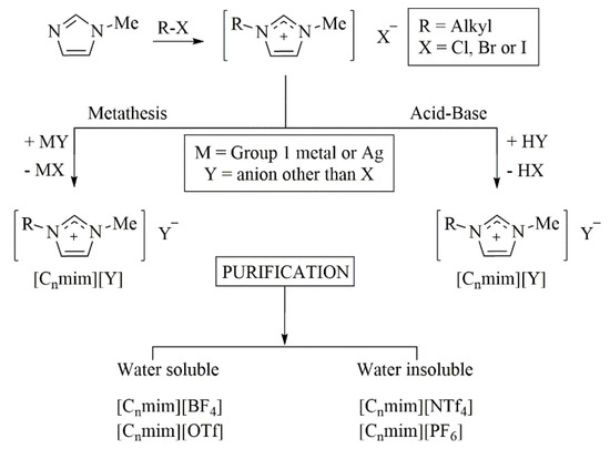 General preparation for the imidazolium-based ILs, which were investigated by Villagrán et al. Reprinted with permission from [138], Copyright 2004 American Chemical Society.