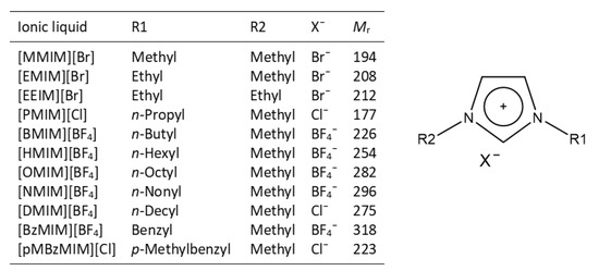 Beside IC and LC techniques, CE and capillary zone electrophoresis (CZE) were also reported. CE was applied by Markuszewski and coworkers [142]. The aim of the study was to evaluate a routine capillary electrophoretic method for the separation of selected imidazolium ionic liquid cations. In Figure 4, all investigated compounds are shown. Several buffers were examined, including phosphate, acetate, fumarate, and citrate in order to achieve the best separation. With respect to both the peak shape and the resolution, a citrate buffer of pH 4.0 was preferred for all further investigations. For validation purposes, the method was applied to samples, which were attained during a photo degradation experiment. The target solute could be well separated from its degradation product and quantified.