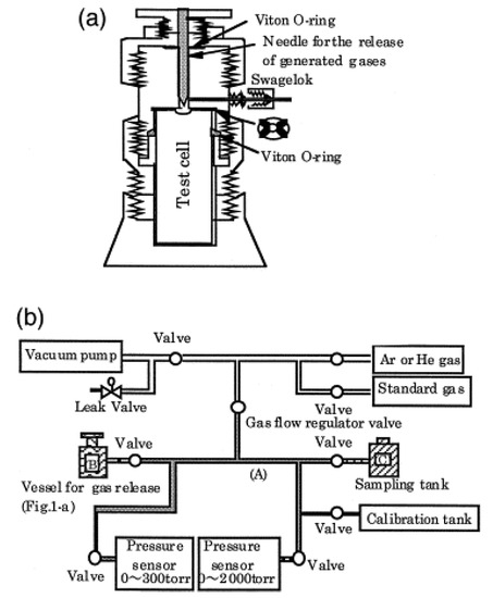 (a) Schematic drawing of the vessel for the release of generated gases in the cells. (b) Schematic diagram of the apparatus for gas volume measurements by Kumai et al. Reprinted with permission from [162], Copyright 1999 Elsevier.
