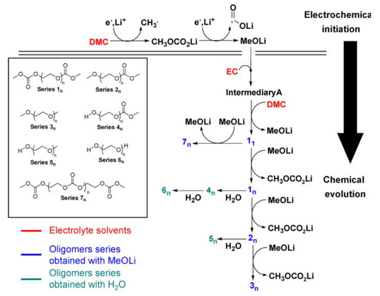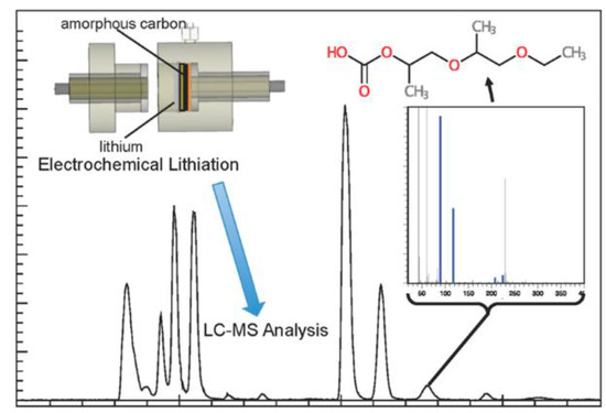 Gourdin et al. investigated the aging of an electrolyte (1.2 M LiPF6 in DEC, EC, PC (4:3:1)) during the initial charging step of a lithium ion capacitor (Figure 7) [163]. The aim of this study was the separation and identification of electrolyte-soluble products after film formation using LC-MS. Several aging products were detected after exposing the electrolyte to elemental lithium; the amount increased after the first lithiation step. Structural elucidation was performed by a detailed analysis of the obtained mass spectra. Thereby, probable structures for decomposition products could be suggested. With regard to mechanistic inferences, one-electron transfer and resulting carbonate oligomers were discussed and mechanisms were proposed.