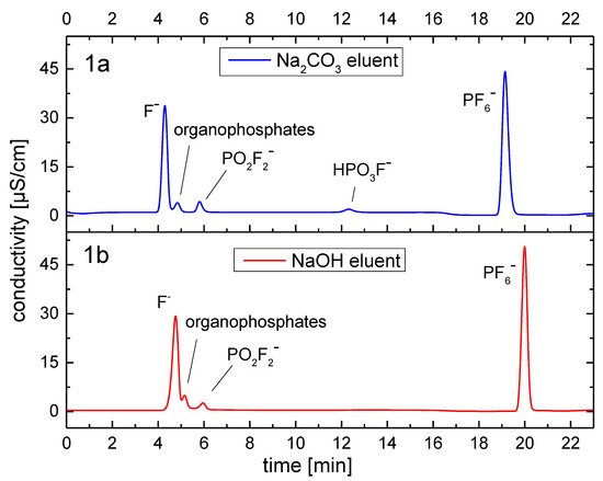 Anion conductivity chromatograms (aqueous Na2CO3and NaOH eluents) of an LP50 electrolyte, which was stored for 15 days at 80 °C (1a: 1.8 mM Na2CO3/1.7 mM NaHCO3, 1b: 9 mM NaOH). The separation was performed with the A Supp 4 column. Reprinted with permission from [50], Copyright 2015 Elsevier.