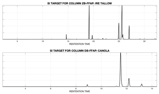 Two strategies for selecting a target chromatogram were employed. When a particular feed stock type was fixed and alignment was applied only within that group (within feedstock), the target was determined to be the sample chromatogram that produced the largest similarity index (SI) [36] within that group. If several groups of feedstocks were aligned together (across feedstock), the target chromatogram was chosen as the sample from all of the groups that produced the largest SI. Plots of the target chromatogram under the second alignment paradigm for columns ZB-FFAP and DB-FFAP are given in Figure 1.
