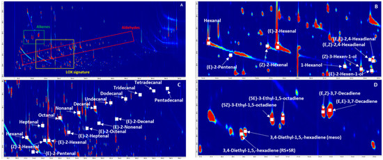 2D pattern of the PGI Toscano EV oil (A), together with some informative patterns of volatiles. The lipoxygenase (LOX) signature is shown in panel (B), linear saturated and unsaturated aldehydes are illustrated in panel (C), while panel (D) shows the enlarged area of branched unsaturated hydrocarbons correlated to olive fruit freshness [34].