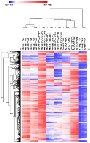 The distribution of about 1500 untargeted and targeted 2D-peak-regions is illustrated as a heat-map in Figure 3. Analyte responses (absolute 2D-peak volume) were normalized using the Z-score (i.e., mean subtraction and normalization to the standard-deviation) and clustered (hierarchical clustering—HC) based on Spearman rank correlation. For each sampling approach, three analytical replicates were computed.