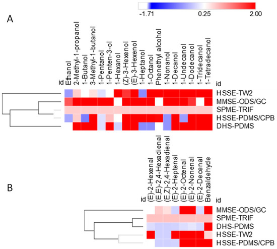 Results were visualized in the heat-map of Figure 4A; alcohols were, in general, better recovered by MMSE-ODS/GC and DHS-PDMS sampling, with the latter showing a mean CF of 120 and a median of 3.36. The alcohols that were recovered most by DHS-PDMS sampling were 2-methyl-1-propanol (CF 1548) and 1-tetradecanol (CF 557). Indeed, DHS shows lower CF values for the most volatile members of the linear series (i.e., ethanol, pentanol, hexanol, heptanol, octanol, and nonanol), most probably because of their breakthrough (see below for further comments). The two C6 unsaturated alcohols ((E) and (Z)-3-hexenol), with a high information potential being fundamental for their green note contribution to the overall flavor, were better recovered by all devices, except SPME-TRIF. It is worth noting that their relative abundance in the sample was so high that their detection by HS sampling was not generally limiting. Phenylethyl alcohol, the aromatic member of this chemical class, showed the opposite tendency, being better enriched by SHS with HSSE-PDMS and dual-phase twisters HSSE-PDMS/CBP.