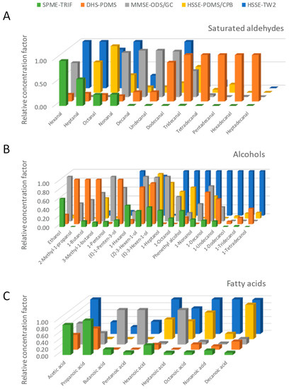 Relative concentration capacity of each device/approach towards selected analyte classes (saturated aldehydes—(A), alcohols—(B), and fatty acids—(C)) with the most effective approach being taken as the reference.