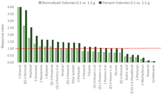 Normalized volume ratios, calculated between 0.1 and 1.5 g of sampling amount, differ widely within the group of analytes considered. A histogram of Figure 6 summarizes the results. In particular, an average value of 1 (highlighted by a red line) was obtained for (Z)-2-penten-1-ol, hexanal, (E)-2-hexenal, ethyl acetate, and 2-pentanol. On the other hand, responses were about 10- and 2.6-fold higher for 1-octanol and (E)-2-decenal, respectively, with 0.1 g of sampling amount. In this last case, displacement effects that occur on the CAR-DVB material reasonably influence the extraction. On the other hand, response ratios for (Z)-3-hexen-1-ol, (E)-2-penten-1-ol, (E)-2-hexen-1-ol, (E)-2-octenal, and (E,E)-2,4-hexadienal were lower at 0.1 g than at 1.5 g. The results clearly highlight the complexity of the multiple-equilibria that coexist in HS-SPME-TRIF sampling and suggest that deeper investigations into HS linearity conditions were needed to validate the hypothesis of HS saturation at the very least. SHS experiments are required to investigate the coexisting effects, such as displacement and phase ratio. Multiple headspace extraction (MHE) was therefore applied to confirm these findings.
