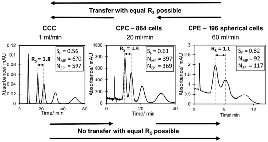The objective is to evaluate whether a transfer of the separation from one unit to another is possible by keeping the resolution between the target compounds constant. First, the different columns are characterized with pulse injections of small injection volume (). This is a similar procedure to LC, where an insignificant injection volume and low feed concentrations are used for the characterization of the column so that column load influences on the elution profile can be neglected [6,28,29]. Subsequently, the stationary phase retention, column efficiency and resolution between the peaks is determined in dependence of flow rate at a set rotational speed. Based on the determined resolution, separation method transferability between the columns can be easily foreseen for the selected type of solvent systems. In this manner, three general possibilities can occur: a resolution between the target compounds higher, equal, or lower compared to the original separation method.
