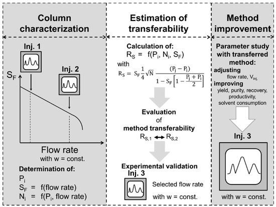 However, the previously described situation, where both columns are extensively characterized with the same solvent system and solute, is usually not given. Often, an application found in literature is intended to be established on the column in the author’s own lab. Still, the separation method transferability could be estimated purposefully as illustrated schematically in Figure 1 without extensive experimental trial and error attempts. First, the separation found in literature is evaluated in terms of separation performance, i.e., resolution. Then, the column where the separation method should be transferred to is characterized: a few pulse injections are performed, in the typical operating range of flow rate and a suitable but constant -field of the column, the resolution is determined, and transferability evaluated. If the obtained resolution is higher than in the original column, further optimization in terms of injection volume, productivity, and solvent consumption could be directly followed. For this purpose, the information about experimentally determined stationary phase retention and column efficiency from the pulse injection experiments and the cell model can be used for simulations [30,31,32]. This approach saves experimental effort and time, and enables a targeted separation method transfer, which is further discussed in Section 3.3.