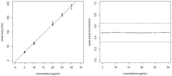 The regression line “peak area vs. concentration” obtained by pooling data from different days (left). The plot of the peak area/concentration ratio vs. concentration shows the variability of the slopes between points (right).