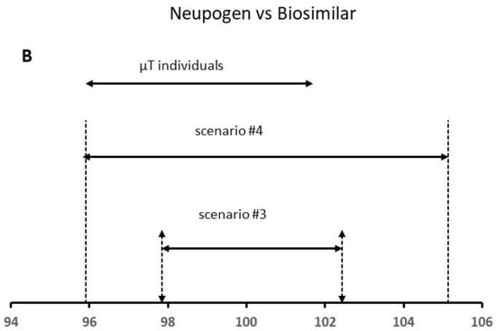 Results of the QR approach for different scenarios using (A) Bevacizumab and (B) Neupogen data. The similarity is demonstrated when the µT individual values are within the QR of the reference product.