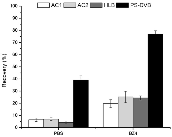 Average extraction efficiency obtained by BAµE-µLD/HPLC–DAD using different activated carbons and polymers sorbent phases for the microextraction of PBS and BZ4 in ultra-pure water, using standard experimental conditions. The error bars represent the standard deviation of 3 replicates.
