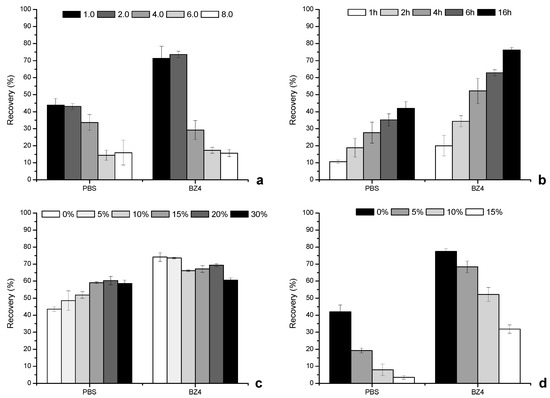 Effect of pH (a), equilibrium time (b), ionic strength (c), and matrix polarity (d) on the microextraction efficiency for both UV filters in ultra-pure water. The error bars represent the standard deviation of three replicates.