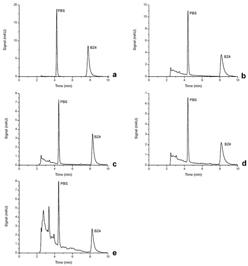 In order to demonstrate the reliability of the proposed methodology for real matrices, BAµE(PS-DVB)-µLD/HPLC–DAD was applied to monitor both hydrophilic UV filters in tap, estuarine, and sea water, as well as wastewater samples. For such purpose and in order to suppress possible matrix interferences, SAM was used for quantitative purposes, by spiking the samples with four working standards, ranging from 0.4 to 8.0 µg L−1 for PBS and 2.0 to 40.0 µg L−1 for BZ4. Blank assays were also performed without spiking to ensure maximum control of the analytical methodology. As expected, in the water matrices studied, any of the analytes were detected (< LODs). As already reported in the literature [14], significant matrix effects were observed during the study of the real matrices, although good selectivity and linearity were achieved, with determination coefficients higher than 0.9940 (BZ4, wastewater sample), obtained from the regression plots (Table 3). Even so, the methodology proposed showed to be influenced by the substantial matrix effects observed, in particular, for the more complex samples, i.e., sea and estuarine water, as well as wastewater. As the UV filters involved are extremely hydrophilic, the higher is the complexity of the matrix, the lower is the average extraction efficiency. For instance, the sea and the estuarine samples studied presented efficiencies which were three-quarters of that obtained for ultra-pure water, and the wastewater presented about one-third. Figure 3 depicts chromatogram profiles obtained from assays performed on spiked (4.0 µg L−1 for PBS and 20.0 L−1 for BZ4) ultra-pure (a), tap (b), sea (c), and estuarine (d) waters, as well as wastewater (e) samples, in which very good selectivity is noticed.