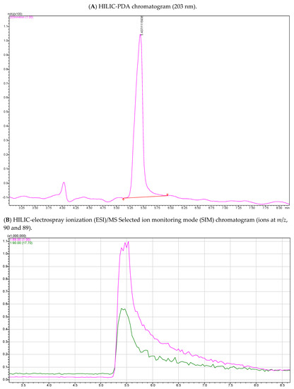 Nevertheless, the HILIC-PDA-ESI/MS method provided comparable LOD-LOQ with the HILIC-PDA method (with phosphate buffer). The latter was mostly attributed to the relatively difficult ionization of OA under the single quadrupole electrospray conditions. In this context, the use of ammonium acetate buffer provided a shorter retention time for OA at 5.5 min (see Figure 2) [21], and a second confirmation ion (at m/z, 90) apart from the deprotonated ion at m/z 89, which constitutes an advantage of this method, since there were works in which OA failed to ionize even under triple quadrupole conditions using ESI [22]. A third diagnostic ion that some guidelines [23] require for mass spectrometric confirmation in SIM mode could not be generated. Although there are published works [24,25] in which SIM with up to two diagnostic ions was applied, additional fragmentation using tandem HILIC-MS/MS conditions was pursued only for extra confirmation (this method exhibited an almost identical LOQ at 1.3 μg/g), since the LOD and the LOQ of the proposed method were deemed sufficient, and insignificant ME and high selectivity were encountered.