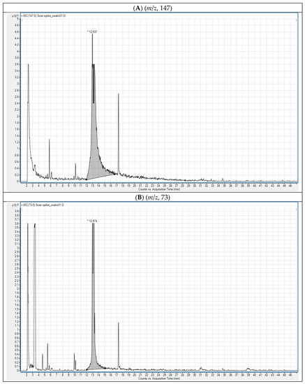 GC-MS extracted ion chromatograms (A,B) of a spiked derivatized OA bee sample at 1 μg/mL.