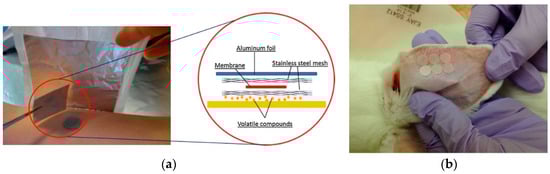 (a) Schematic diagram of the “membrane sandwich” headspace sampling for skin volatiles sampling. (b) Polydimethylsiloxane (PDMS) patches placed over the ventral ear surface for direct sampling. These were then covered with PTFE (polytetrafluoroethylene) and Tegaderm® (not shown). Reproduced from [34,35], with permission from Elsevier and IOP Publishing, 2019.