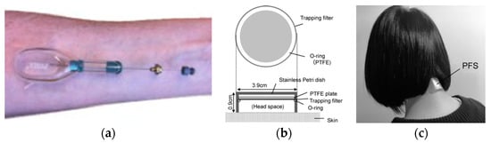 (a) Headspace sampling volatiles on the volar forearm using a wearable housing integrating solid phase microextraction (SPME) fiber, affixed to the skin with surgical tape. (b) Schematic view of the passive flux sampler for human skin gas. (c) Sampling of 2-nonenal and diacetyl at the nape of the neck. The PFS (passive flux sampler) was fixed by a piece of medical tape. Reproduced from [63,73], with permission from Wiley and Elsevier, 2019.