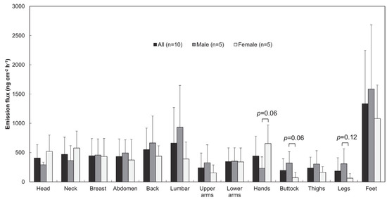 Comparison of emission flux of ammonia emanating from 13 sampling positions of ten volunteers. Error bars show standard deviation of measured values of tested volunteers (n = 10 for all, n = 5 for male, and n = 5 for female volunteers). Reproduced from [74], with permission from Elsevier, 2019.