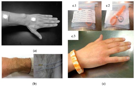 (a) Sampling of volatile chemicals on the forearm and back of the hand before and after cigarette smoking or exposure to second hand smoke (SHS). (b) Wrist (left) and ankle (right) sampling using a PDMS loop passive sampling device. (c) c.1–2 bags used for transport that were attached to track participant ID and exposure time in the occupational deployments; c.3 single wristband deployment. Reproduced from [75,77,78], with permission from Elsevier and ACS Publishing, 2019.