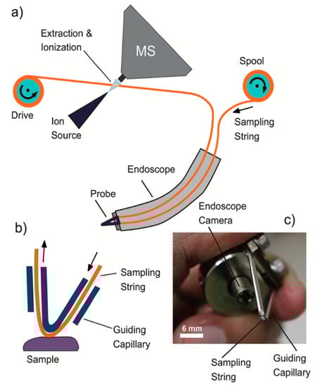- Chen, L.C.; Naito, T.; Tsutsui, S.; Yamada, Y.; Ninomiya, S.; Yoshimura, K.; Takeda, S.; Hiraoka, K. In vivo endoscopic mass spectrometry using a moving string sampling probe. Analyst 2017, 142, 2735–2740. [Google Scholar] [CrossRef]
