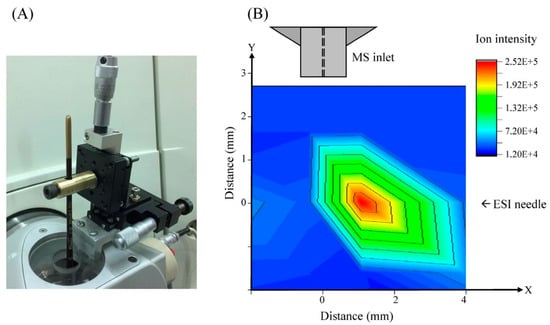 Photo (A), a picture of the sampling brush–spray ionization/mass spectrometry set up used in this study. The sampling brush was located between the mass inlet and the ESI needle (not shown in the picture). (B) relationship between ion intensities and the location of the brush. In this case, caffeine was used as the test sample (concentration levels, 10 µg mL−1) and the ESI voltage was +4.5 kV. The position, indicated in red, denotes the optimized location. Reproduced from [88], with permission from Elsevier, 2019.