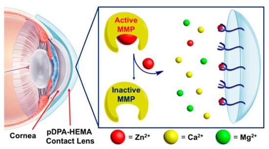 Schema of deactivation of matrix metalloproteinases (MMPs) by the dipicolylamine–poly(2-hydroxyetyl methacrylate (pDPA–HEMA)-based contact lens. Reproduced from [89], with permission from ACS Publications, 2019.