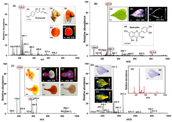 (a) Desorption electrospray ionization mass spectrometry (DESI–MS) spectrum from a turmeric rhizome slice of an imprinted nylon nanofiber mat. (a,b) Optical images of a whole and unskinned turmeric rhizome. (c) Imprinted slice on a nylon nanofiber mat. (d) DESI–MS image at m/z 219 due to α-turmerone shown. Reproduced from [91], with permission from ACS Publications, 2019.