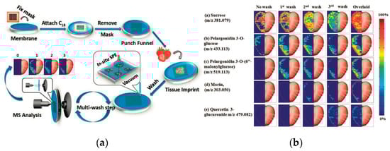 (a) Flow chart of C18-mounted solid phase extraction (SPE) micro-funnel-based spray for Ion-mobility spectrometry (IMS). (b) Chemical images of major components of a strawberry using C18-mounted SPE micro-funnel based spray MS with 0–3 washing steps. Reproduced from [92], with permission from SAGE, 2019.