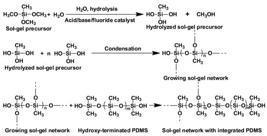 Representation of the reactions involved during the synthesis of a sol-gel hybrid organic-inorganic polymeric network, reproduced from [68] with permission from Elsevier, 2013.