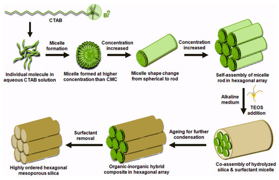 Schema of the formation of highly ordered mesoporous silica, reproduced from [70] with permission from Wiley, 2016.