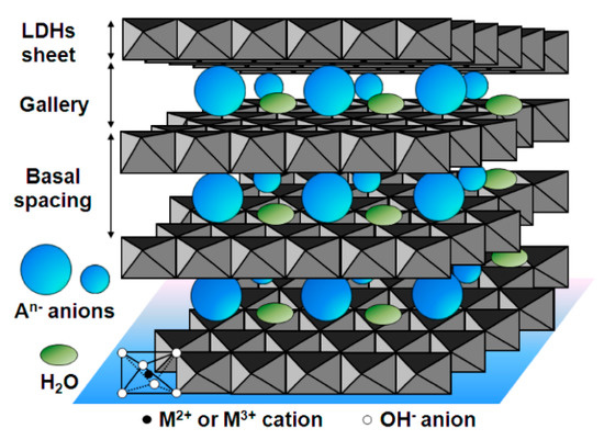 Schema of the representation of layered double hydroxides (LDHs), reproduced from [72] with permission from MDPI, 2014.
