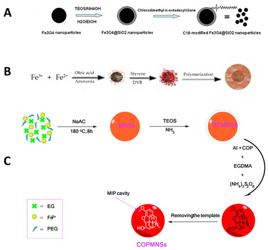 Schema of the synthetic procedure for obtaining (A) Fe3O4@SiO2-C18, (B) Fe3O4@PS-DVB, and (C) Fe3O4@SiO2-polymer-MIP. Reproduced from [81] and [82] with permission from Elsevier, 2010 and 2012, respectively; and from [85] with permission from The Royal Society of Chemistry, 2016.