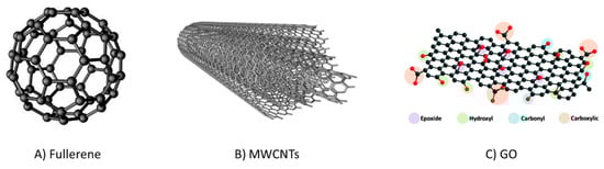 Examples of carbon nanomaterials used in SPE. Fullerene, (A); multi wallet carbon nanotubes (MWCNTs), (B); graphene oxide (GO), (C).